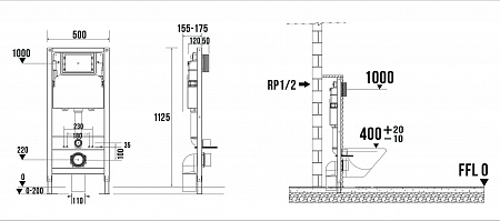 Пневматическая система инсталляции для подвесного унитаза 500х1125 (4 в 1 с клавишей смыва) Terminus